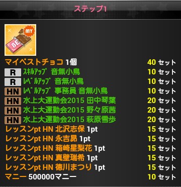 | マイベストチョコ | その他 | アイドルフィーチャリング時に使うと 必ずベストチョイスになる。 ベストチョコよりも 優先的に使用される。 | イベント参加報酬 ガシャ特典 引換券交換所 ひとこと送信 オフショット閲覧報酬 | 消滅 |